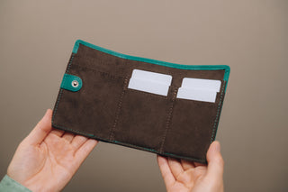 小銭、お札、カード7枚がコンパクトに収納できる三つ折り財布。