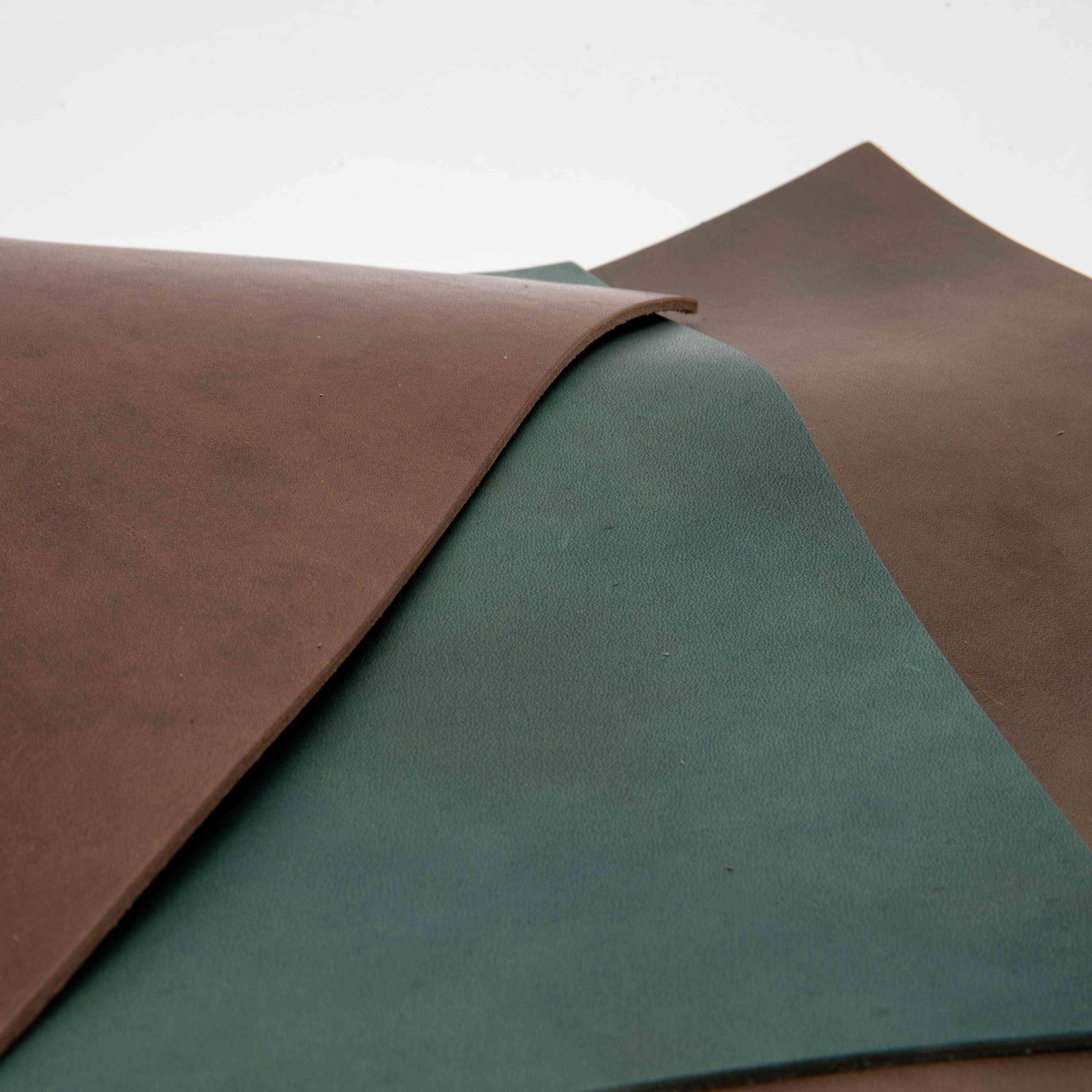 植物タンニンとクロムなめしのヌメ革を染料で染めたあと、