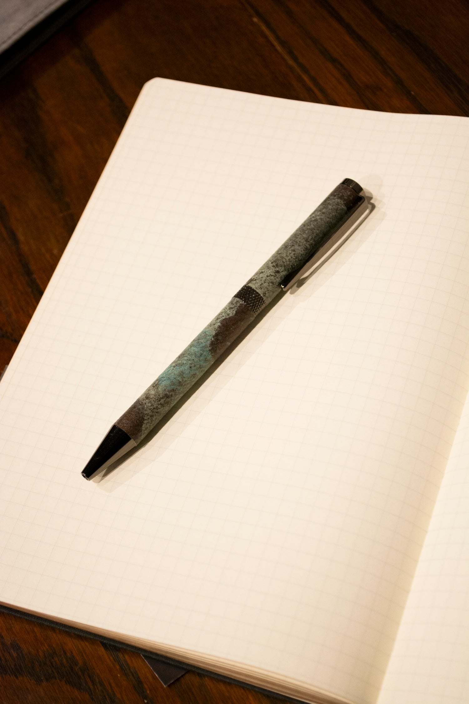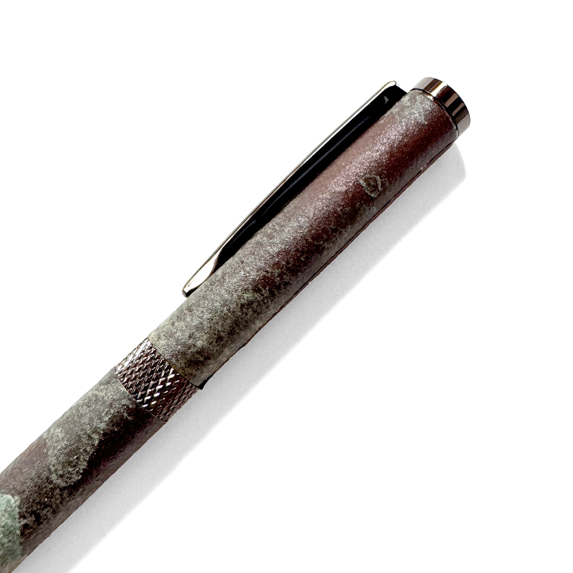 The rust-aged leather is created by spraying brass, red copper, or iron onto the leather surface to evoke the appearance of rust, and each piece has a slightly different look.